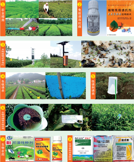 Technical mode1.农业措施(品种、冬春耕锄、冬季修剪、多元种植)→2.植物免疫诱导抗病→3.太阳能风吸式杀虫灯→4.色板诱杀→5.性诱剂诱杀→6.生物导弹等天敌应用→7.生物农药→8.化学农药应急防控。