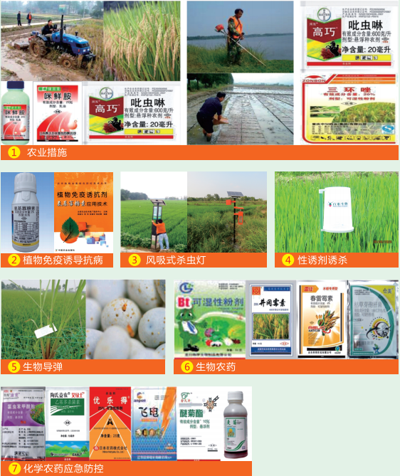 1.农业措施(耕整灌溉、品种、浸种、浸种拌种、铲除杂草、调整播期、带药移栽、生态种植)→2.植物免疫诱导抗病→3.风吸式杀虫灯→4.性诱剂诱杀一5.生物导弹一→6.生物农药→7.化学农药应急防控。